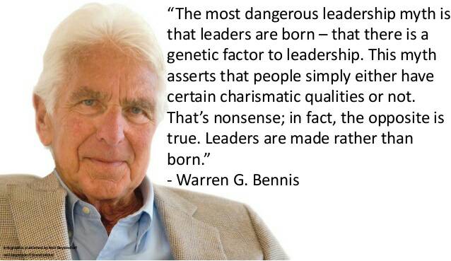 เป็นโดยกำเนิด นั่นคือเรามีปัจจัยทางพันธุกรรมของความเป็นผู้นำ ความเชื่อปรัมปรานี้ยืนยันว่าบุคคลเพียงแต่มีคุณสมบัติเชิงบารมีบางอย่างหรือ นั่นคือเหลวไหล ที่จริงแล้วตรงกันข้ามกับความจริง ผู้นำได้ถูกสร้างขึ้นมา ไม่ใช่เป็นโดยกำเนิด