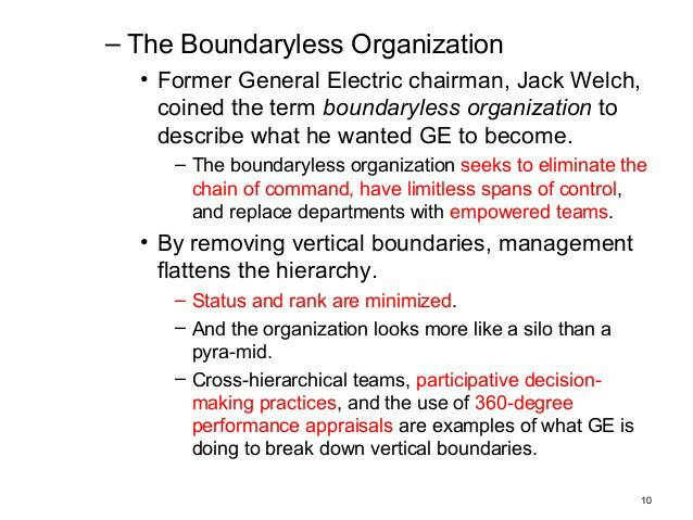 การใช้โครงสร้างแบบแนวนอน/ทีม สามารถกำจัดพรมแดนเหล่านี้ได้  แจ็ค เวลซ์ ยืนยันว่าเราไม่ต้องการระบบราชการที่อ้วนใหญ่ เราต้องการการไร้พรมแดน พรมแดนของบริษัททุกอย่าง
