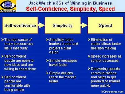 แจ็ค เวลซ์ ได้กล่าวถึง 3S’s ของการได้ชัยชนะภายในธุรกิจคือ  ความเชื่อมั่นตนเอง(Self Confiddent) ความรวดเร็ว(Speed) และความเรียบง่าย(Simplicity)  ระบบราชการสนับสนุนความเป็นระเบียบแบบแผนที่ทำให้บริษัทช้าลง ระบบราชการต่อต้านทั้งความเรียบง่ายและความรวดเร็ว   เราต้องใช้ 3S’s ทำลายระบบราชการและฐานะเดิม