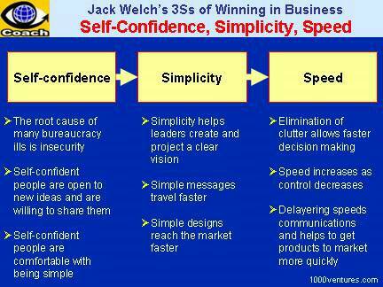 แจ็ค เวลซ์ ได้กล่าวถึง 3S’s ของการได้ชัยชนะภายในธุรกิจคือ  ความเชื่อมั่นตนเอง(Self Confiddent) ความรวดเร็ว(Speed) และความเรียบง่าย(Simplicity)  ระบบราชการสนับสนุนความเป็นระเบียบแบบแผนที่ทำให้บริษัทช้าลง ระบบราชการต่อต้านทั้งความเรียบง่ายและความรวดเร็ว   เราต้องใช้ 3S’s ทำลายระบบราชการและฐานะเดิม