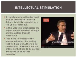 3 การกระตุ้นสติป้ญญา ผู้นำเชิงปฏิรูปให้คุณค่าต่อความคิดสร้างสรรค์และความเป็นอิสระแก่บุคคล การสนับสนุนบุคคลให้มีส่วนร่วมภายในการตัดสินใจ 4 การมุ่งบุคคล ผู้นำเชิงปฏิรูปจะมุ่งความต้องการและความรู้สึกของบุคคล การให้ความสนใจส่วนบุคคลแก่บุคคลแต่ละคน