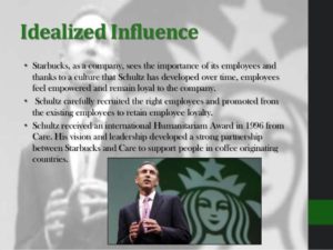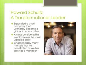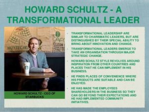 โฮวาร์ด ชูลท์ ซีอีโอ ของสตาร์บัคส์โฮวารด ชูลท์ จะเป็นผู้นำเชิงปฏิรูป เนื่องจากบุคคลิกภาพที่มีบารมีของเขา และความสามารถที่จะใช้อิทธิพลทางอุดมการณ์ การจูงใจบันดาลใจ การกระตุ้นสติปัญญา และการพิจารณาบุคคล ที่จะบรรลุเป้าหมายของเขา เขาสามารถที่จะสร้างความไว้วางใจและความเชื่อมั่นภายในบุคคลของเขา เพราะว่าเขาเชื่อว่าบุคคลไม่สามารถปฏิบัติงานได้ถ้าพวกเขาขาดความเชื่อมั่น เขาได้จูงใจหุ้นส่วนของเขาด้วยการมองในแง่ดีเกี่ยวกับอนาคต และชักจูงให้พวกเขาร่วมวิสัยทัศน์สตาร์บัคส์จะเป็นสถานที่ทำงานที่พิเศษ และพวกเขากำลังทำงานไปสู่เป้าหมายทีมีคุณค่า การทำให้โลกดีขึ้นด้วยการบริการ ผลิตภัณฑ์ หรือบริษัท