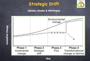 นอกจะกำเนิดภายนอกบริษัท อย่างเช่น การเปลี่ยนแปลงความพอใจของลูกค้า ความก้าวหน้าทางเทคโนโลยีและการแข่งขันเพิ่มขึ้น ปัจจัยภายในและภายนอกเหล่านี้สร้างช่องว่าง ตรงที่กลยุทธ์ขององค์การเยื้องแนวกับสภาพแวดล้อมของมัน ที่นำไปสู่การตกต่ำภายในผลการดำเนินงานตลอดเวลา