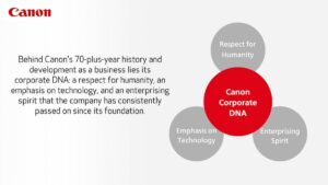 บริษัทได้ถ่ายทอดจิตวิญญานผู้ประกอบการอย่างสม่าเสมอนับตั้งแต่การก่อตั้ง จิตวิญญานผู้ประกอบการตรงที่แคนนอนได้เริ่มต้นเป็นธุรกิจ และเเรงขับเคลื่อนอย่างไม่ย่อท้อที่จะแตกต่างตัวมันเองผ่านทางเทคโนโลยี ซึมซับทั่วทั้งบริษัท และจัดหาความก้าวหน้าใหม่แก่สังคมอย่างต่อเนื่อง ปัจจัยจูงใจเหล่านี้ได้สนับสนุนโดยการเคารพมนุษย์ ประกอบด้วยความมีคุณธรรม และการมุ่งสุขภาพที่ดี แคนนอนผูกพันต่อการส่งต่อดีเอ็นเอของบริษัทไปสู่รุ่นในอนาคต