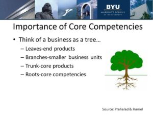 บริษัทเหมิอนกับต้นไม้ ใหญ่ ลำต้นคือผลิตภัณฑ์แกน กิ่งก้านคือหน่วยธุรกิจ และดอกไม้ ใบไม้ ผลไม้ คือผลิตภัณฑ์สำเร็รูป แต่รากของต้นไม้คือความสามารถแกน เนื่องจากรากจะหล่อเลี้ยงต้นไม้ให้เจริญเติบโตและแข็งแรง เราอาจจะมองไม่เห็นจุดแข็งของคู่แข่งขันด้วยการมองที่ผลิตภัณฑ์สำเร็จรูป ทำนองเดียวกันเราอาจจะมองไม่เห็นความแข็งแรงของต้นไม้ ด้วยการดูที่ดอกไม้ ใบไม้ และผลไม้