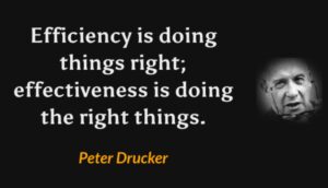 ทฤษฎีธุรกิจของ ปีเตอร์ ดรัคเกอร์ ได้พิจารณาความเเตกต่างระหว่างประสิทธิภาพ การทำอะไรอย่างถูกต้อง และประสิทธิผล การทำอะไรที่ถูกต้อง ผลงานของเขามุ่งเน้นว่าในขณะที่ประสิทธิภาพมุ่งประสิทธิภาพสูงสุดของการใช้ทรัพยากร ความสำเร็จอย่างแท้จริงของธุรกิจจะมาจากประสิทธิผลภายในการบรรลุเป้าหมายสำคัญที่สุด เขายืนยันว่า องค์การต้องมุ่งที่ประสิทธิผลก่อน การระบุ และการทำ “สิ่งที่ถูกต้อง” เมื่อสิ่งที่ถูกต้องได้ถูกระบุแล้วจุดมุ่งสามารถที่จะเปลี่ยนแปลงไปที่ประสิทธิภาพ การทำมันอย่างมีประสิทธิภาพ ประสิทธิผลต้องมาก่อนการมุ่งที่ประสิทธิภาพโดยไม่พิจารณาสิ่งที่ถูกต้องก่อนสามารถนำไปสูความพยายามที่้เสียเปล่า