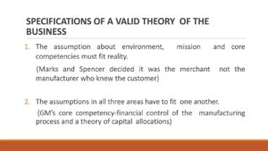 เนอรัล มอเตอร์ การมุ่งเน้นสมมุติฐานที่บริษัทสร้างเกี่ยวกับสภาพแวดล้อม ภารกิจ และความสามารถแกนของมัน สมมุตุฐานของมันจะเป็นหัวใจธุรกิจทุกอย่างจะดำเนินงานบนทฤษฎีธุรกิจ ทฤษฎีธุรกิจของบริษัทจะกลายเป็นล้าสมัยถ้าไม่สอดคล้องกับสภาพแวดล้อมที่เปลี่ยนแปลง ปีเตอร์ ดรัคเกอร์สังเกตุว่าธุรกิจหลายอย่างล้มเหลว เกิดขึ้นจากความไม่สอดคล้องระหว่าง