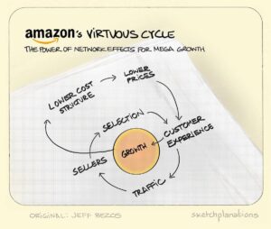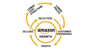 …..เจฟฟ์ บีซอสและผู้บริหารของเขาได้วาดวงจรที่ถูกต้องของพวกเขาเอง พวกเขาเชื่อว่าให้พลังแก่ธุรกิจของพวกเขา มันเป็นบางสิ่งบางอย่างทำนองนี้ : ราคาต่ำนำไปสู่ลูกค้ามากขึ้น ลูกค้ามากขึ้นเพิ่มปริมาณขาย และดึงดูดผู้ขายฝ่ายที่สามจ่ายค่าหน้าต่อเว็บไซต์มากขึ้น ทำให้อเมซอนเอาต้นทุนคงที่ออกไปมากขึ้น เหมือนเช่นศูนย์คลังสินค้า และบริการที่ดำเนินเว็บไซต์ ประสิทธิภาพ