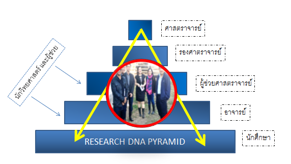 แนวคิดในสร้างพีรามิด (Research DNA Pyramid)โดยมีอาจารย์ที่มีประสบการณ์การวิจัยอยู่ตรงตำแหน่งยอดพีรามิด และไล่เลียงลงมาตามลำดับจนถึงนักศึกษาระดับปริญญาตรี โทและเอกจะเป็นการสร้างระบบการจำลองดีเอ็นเอวิจัยได้ และถ่ายทอดประสบการณ์และองค์ความรู้ด้านการวิจัยจากรุ่นสู่รุ่นได้