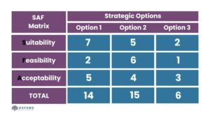 ทางเลือกบนพื้นฐานของเกณฑ์สามข้อคือความสอดคล้อง ความเป็นไปได้ และการยอมรับ เพื่อการให้คะเเนนมัน เราต้องระบุกลยุทธ์ทางเลือก และให้คะเเนนตามเกณฑ์เหล่านี้ภายในตารางเอสเอฟเอที่มักจะใช้ระดับอย่าง