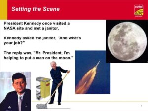ประธานาธิบดี จอห์น เคนเนดี ได้มองเห็ภารโรงถือไม้กวาด เขาได้เดินเข้าไปหาและกล่าว ไฮ ผมเเจ็ค เคนเนดี คุณกำลังทำอะไรอยู่ ภารโรง