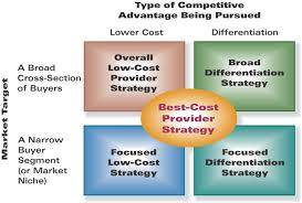 บริษัทสามารถกำหนดราคาต่ำกว่าคู่แข่งขันที่ขายผลิตภัณฑ์ที่มีคุณลักษณะความดึงดูดอย่างเดียวกัน บ่อยครั้งลูกค้าจำนวนมากจะชอบผลิตภัณฑ์ที่อยู่ตรงกลาง ไม่ใช่ราคาถูกเหมือนกับผลิตภัณฑ์พื้นฐานของผู้นำทางต้นทุน หรือไม่ใช่ราคาแพงเหมือนกับผลิตภัณฑ์คุณภาพสูงของผู้สร้างความแตกต่าง แต่ถ้าบริษัทไม่มีทรัพยากรและความสามารถของการสร้างผลิตภัณฑ์ที่มีคุณภาพสูง ณ ต้นทุนที่ต่ำกว่าคู่แข่งขันแล้ว กลยุทธ์ต้นทุนที่ดีที่สุดไม่ควรจะถูกแนะนำ ตัวอย่างที่ดีของการใช้กลยุทธ์ต้นทุนที่ดีที่สุดได้บรรลุความสำเร็จคือ การผลิตรถยนต์รุ่นเล็กซัส ของโตโต้า มอร์เตอร์