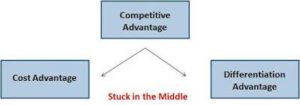 ไมเคิล พอร์เตอร์ ได้ใช้ถ้อยคำว่า “การติดอยู่ตรงกลาง” เรียกบริษัทที่ไม่สามารถสร้างข้อได้เปรียบทางการแข่งขันด้วยกลยุทธ์อย่างใดอย่างหนึ่งก่อนหน้านี้ได้เลย