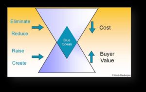 ตรงกันข้าม ชาน คิม และเรเน โมบอญ ยืนยันว่ากลยุทธ์สีน้ำเงินจะแสวงหาการรวมกันของต้นทุนต่ำและความแตกต่างด้วยการใช้ถ้อยคำว่า “นวัตกรรมทางคุณค่า” สร้างแพลทฟอร์มที่จะนำบริษัทออกจากทะเลสีแดงที่วุ่นวายด้วยปลาฉลามวนเวียนอยู่ ไปสู่ทะเลสีน้ำเงินที่มีปลาอย่างมากมายภายในหนังสือ Blue Ocean Strategy ชาน คิม และเรเน โมบอญ ได้พยายามจะเชื่อมโยงระวห่างนวัตกรรม อรรถประโยชน์ ราคา และต้นทุน พวกเขาได้ท้าทายการต้องเลือกระหว่างความแตกต่างและต้นทุนต่ำด้วยการยืนยันว่าทั้งความแตกต่างและต้นทุนต่ำจะบรรลุความสำเร็จด้วยกันได้