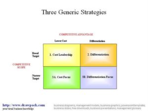 ไมเคิล พอร์เตอร์ ได้ประยุกต์ใช้เศรษฐศาสตร์สม้ยเดิมกับกลยุทธ์การแข่งขัน ตามโมเดลกลยุทธ์การแข่งขันของไมเคิล พอร์เตอร์แล้ว บริษัทมีกลยุทธ์การแข่งขันอยู่สามทางเลือก เพื่อที่จะใช้สร้างข้อได้เปรียบทางการแข่งขันที่เหนือกว่าคู่แข่งขันภายในอุตสาหกรรมคือ 1 กลยุทธ์ความเป็นผู้นำทางต้นทุน 2 กลยุทธ์การสร้างความแตกต่าง 3 กลยุทธ์การจำกัดขอบเขต