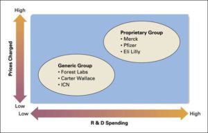 เนื่องจากกลยุทธ์การวางตำแหน่งของบริษัทยาลอกเลียนแบบจะมุ่งที่การลอกเลียนแบบยาที่บุกเบิกของบริษัทยาที่มีลิขสิทธ์โดยที่สิทธบัตรหมดอายุแล้ว พวกเขาจะมีค่าใช้จ่ายอาร์ แอนด์ ดี ต่ำ และมุ่งการแข่งขันทางราคา บริษัทยาลอกเลียนแบบจะใช้กลยุทธ์ความเสี่ยงภัยต่้ำและผลตอบแทน่ต่ำ เนื่องจากพวกเขาไม่ต้องลงทุนหลายร้อยล้านเหรียญกับการคิดค้นยาตัวใหม่ และกำหนดราคายาไว้ต่ำ