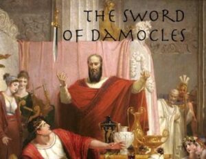 ตามเรื่องราว ดาโมเคลส เป็นข้าราชบริพารของไดโอไนเซียสแห่งไซราคิวภายในซิซิลี ดาโมเคลส ได้ประจบกษัตริย์ของเขา ไดโอไนเซียสโชคดีอย่างแท้จริงเป็นบุคคลยิ่งใหญ่แห่งอำนาจ ล้อมรอบด้วยความหรูหรา เขาอิจฉาความมั่งคั่ง อำนาจ และความสุขของการเป็นกษัตริย์ภายในการตอบสนอง ไดโอไนซียส ได้เสนอสลับที่กับดาโมเคลสหนึ่งวัน เพื่อที่ดาโมเคลสสามารถลิ้มรสโชคดีโดยตรงของการเป็นกษัตริย์ดาโมเคลส ไม่ได้เชื่อโชคของเขา แต่เพียงแค่เขาเริ่มต้นสนุกชีวิตของกษัตริย์ เขาได้สังเกตุว่าไดอาไนเซียสได้เเขวนดาบคมจากเพดาน วางตำเเหน่งเหนือหัวของเขา ห้อยอยู่ด้วยขนเส้นเดียวจากหางของม้า การรับรู้ว่าอันตรายมากับการปกครองอาณาจักร ดังนั้นดาบดาโมเคลส ได้แสดงสัญลักษ์ณ์อันตรายที่ใกล้เข้ามาดาโมเคลส ได้กลายเป็นท่วมท้นด้วยความกลัว และความวิตกกังวลไม่สามารถสนุกกับความหรูหราของอำนาจใหม่ที่เพิ่งค้นพบใหม่ของเขาเขาวิ่งออกไปจากห้อง ขอออกจากตำแหน่งเป็นกษัตริย์ของเขา ณ วันนั้นต่อซิเซโรแล้วเรื่องราวของไดโอไนเซียสเป็นตัวอย่างแท้จริงของอันตรายความกดดัน และความหวาดระเเวงอย่างมากมากับอำนาจยิ่งใหญ่ของการปกครอง เขายืนยันว่าบุคคลที่มีอำนาจกลัวความตายอยู่เสมอและไม่สามารถมีความสุขแท้จริงถ้อยคำ ดาบแห่งดาโมเคลส ได้ถูกใช้โดยทั่วไปในขณะนี้เป็นคำศัพท์เฉพาะอธิบายอันตรายจะเกิดขึ้น ทำนองเดียวกัน แขวนโดยเส้นด้ายได้กลายเป็นคลังศัพท์ต่อสถานการณ์ที่อันตรายหรือล่อเเหลม ภายในอังกฤษ ถ้อยคำดาบแห่งดาโมเคลสได้ถูกใช้และอ้างถึงบ่อยครั้งเมี่อเรากล่าวถึงอำนาจและความกลัวของผู้ปกครองเราไม่ควรจะอิจฉาตำแหนึ่งของบุคคลอื่น เเม้ว่าพวกเขาอาจจะปรากฏมีชีวิตที่สมบูรณ์ พวกเขาอาจจะรับภาระที่ไม่สามารถมองเห็น ดาบแห่งดาโมเคลส เป็นสัญลักษณ์ของการคุกคามสามารถมาผ่านไปได้ทุกเวลาต่อไดโอไนเซียสแล้ว ดาบแสดงการคุกคามของการฆ่า หรือทรยศโดยบุคคลของเขาเองตำนานของดาโมเคลสได้ยั่งยืนเป็นเรื่องราวที่นิยมแพร่หลายมากเป็นศตวรรษ จุดสุดยอดของเรื่องราวได้ถูกเเสดงภายในการวาดภาพสีน้ำมัน “1812 Sword of Damoclase” โดย ริชาร์ด เวสทอลล์การใช้ที่มีชื่อเสียงมากขึ้นของมันเกิดขึ้นเมื่อ ค.ศ 1961 ระหว่างสงครามเย็น เมื่อประธานาธิบดี จอห์น เคนเนดี ได้ให้คำปราศัยแก่สหประชาชาติเขาได้กล่าวว่า ผู้ชาย ผู้หญิง และเด็กทุกคน มีชีวิตอยู่ข้างใต้ดาบแห่งดาโมเคลส แขวนด้วยเส้นด้ายบางที่สุด สามารถถูกตัดได้ ณ เวลาใดก็ตามโดยอุบัติเหตุหรือการคาดผิด หรือโดยความบ้าของเรา อาวุธสงครามต้องถูกกำจัด 