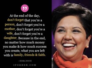 อินดรา นูยี กล่าวว่า ฉันไม่คิดว่าผู้หญิงสามารถมีทุกอย่างได้ ฉันเพียงแค่คิดเช่นนั้น เราแสร้งว่าเรามีทุกอย่าง เราแสร้งว่าเราสามารถมีทุกอย่าง สามีของฉันและฉันแต่งงานมาแล้ว 34 ปี และเรามีลูกสาวสองคน และทุกวันเราตัองตัดสินใจเกี่ยวกับเราจะเป็นภรรยาหรือแม่หรือไม่ ที่จริงแล้วหลายครั้งระหว่างวันเราต้องตัดสินใจเหล่าานี้ และเราต้องเลือกบุคคลหลายคนช่วยเรา เราเลือกครอบครัวของเราที่จะช่ายเรา เราวางแผนชีวิตของเราอย่างพิถีพิถัน ดังนั้นเราสามารถเป็นพ่อแม่ที่เหมาะสม