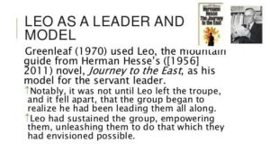 ที่จริงแล้วลีโอคือผู้นำตลอดกาล แต่เขาคือผู้รับใช้ก่อน เพราะว่านั่นคือสิ่งที่อยู่ลึกลงไปข้างใน นั่นคือคุณลักษณะที่แท้จริงของเขา เขาได้รับตำแหน่งความเป็นผู้นำ แต่โดยลักษณะแล้วเขาคือผู้รับใช้ บุคคลบางคนที่มุ่งการช่วยเหลือบุคคลอื่น ตำแหน่งความเป็นผู้นำของเขาที่ให้แก่เขาสามารถถูกยึดคืนไปได้ ลักษณะผู้รับใช้ของเขา – ความต้องการของเขาที่จะช่วยเหลือบุคคลอื่น จะเป็นส่วนหนึ่งของคุณลักษณะของเขาที่ไม่สามารถยึดคืนไปได้ นั่นคือทำไมเขาเป็นผู้รับใช้ก่อน ผู้รับใช้ด้วยหัวใจ