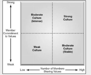 วัฒนธรรมองค์การที่เข้มแข็งเเสดงให้เห็นโดยค่านิยมพื้นฐานของบริษัทที่ทั้งถูกยึดอย่างเช้มข้นเเละร่วมกันอย่างกว้างขวางรูปเเสดงให้เห็นว่าบุคคลมีค่านิยมพื้นฐานร่วมกันและผูกพันต่อค่านิยมพื้นฐานของบริษัทมากเท่าไร วัฒนธรรมองค์การยิ่งมีความเข้มแข็งมากขึ้นเท่านั้น วัฒนธรรมที่เข้มแข็งจะเปลี่ยนแปลงได้ยาก ดังนั้นบริษัทที่มีว้ฒนธรรมที่เข้มแข็งจะพยายามใช้กลยุทธ์สอดคล้องกับวัฒนธรรมของพวกเขา วัฒนธรรมองค์การที่ไม่สอด