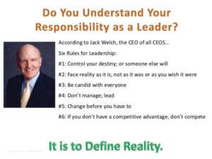 ผู้บริหารจะไม่กลัวการเปลี่ยนแปลง มันเป็นเพียงโอกาสอย่างหนึ่งที่จะมองเกมจากมุมใหม่ และเปิดบทใหม่ภายในธุรกิจของเรา สถานการณ์ที่ตกต่ำและยากลำบากจะธรรมดาภายในตลาด และจุดอ่อนหรือความอ่อนแอจะไม่ใช่บางสิ่งบางอย่างที่ผู้บริหารธุรกิจจะต้องกลัว ความจริงจะไม่ทำให้ผู้นำที่ดีกลัว เพราะว่าพากเขาไม่ได้ซ่อนข้อเท็จจริง พวกเขารู้ว่าบุคคลคุ้นเคยกับข้อเท็จจริง หลายครั้งที่บริษัทว่าจ้างผู้บริหารที่ไม่ต้องการเปลี่ยนแปลงและติดอยู่กับที่ พวกเขาไม่สามารถเคลื่อนออกไปจากตำแหน่งของพวกเขาได้ พวกเขาชอบปล่อยผู้บริหารไว้ แม้ว่าธุรกิจจะไม่ทำกำไร ความจริงและความซื่อสัตย์จะเป็นค่านิยมทีสำคัญต่อผู้บริหาร บุคคลที่พยายามจะวิ่งจากมันไม่สามารถเผชิญความเป็นจริงได้ เจ็นเนอรัล อิเเล็คทริคจะมีผู้บริหารดังกล่าวนี้ด้วย ไม่พร้อมจะเผชิญกับความเป็นจริง หรือซื่อตรงกับตัวพวกเขาเองหรือบุคคลอื่น