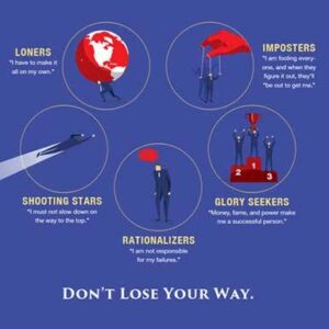เสียการมองเข็มทิศภายในของพวกเขา เรามีผู้นำต้นแบบห้าอย่างที่ตกรางจากเส้นทางของพวกเขาคือ ผู้หลอกลวง ผู้หาเหตุผลเข้าตัวเอง ผู้แสวงหาชัยชนะ