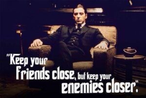 คิง เลียร์ มีแรงจูงใจแบ่งอาณาจักรของเขาท่ามกลางลูกสามคนของเขา ในฐานะของวิถีทางอย่างหนึ่งทดสอบความรักของพวกเขาต่อเขา เขาได้ถามลูกสาวแต่ละคนประกาศความรักของเธอต่อเขาด้วยคำสัญญาลูกสาวที่รักเขามากที่สุดจะได้รับส่วนใหญ่ที่สุดของอาณาจักรของเขา คิง เลียร์ ได้ทดสอบลูกสาวของเขาโดยมองความจงรักภักดีของพวกเขาต่อเขาและอาณาจักร เขาต้องการมองลูกสาวคนไหนรักเขาจริง ไม่ใช่มงกุฏของเขา โชคไม่ดีเขาได้ช้าเกินไปที่คอร์เดเลียเป็นลูกสาวคนเดียวที่รักเขาจริงจุดสำคัญของคิง เลียร์ คือ คิง เลียร์ วัยราแห่งอำนาจที่ยิ่งใหญ่กำลังแบ่งอำนาจของเขาระหว่างลูกสาวสามคน – เขาไม่มีลูกชาย – อย่างไร ส่วนได้เสียสูง เพราะว่าถ้าเขาตัดสินใจไม่ฉลาด อาณาจักรจะถูกปกครองได้ไม่ดีและเเม้แต่ตกลงไปสู่สงครามกลางเมืองภายในเดอะ กอดฟ่าเธอร์ วีโต คอร์ลีโอเน มีลูกชายสามคนไม่ใช่ลูกสาวแต่กระนั้นเรื่อวราวคล้ายกัน เขามีลูกเลี้ยงคนหนึ่ง ทอม เฮเกน ดังนั้นด้วยความรู้สึกเขามีลูกชายสี่คน แต่จุดสำคัญเป็นความคล้ายคลึงที่คลุมเครือต่อคิง เลียร์ เขาจะเเบ่งอำนาจอย่างไร และโดยเฉพาะมากขึ้นเขาจะเลือกผู้สืบทอดอย่างไรไมเคิล คอร์ลีโอเนไม่ใช่คอร์เดเลีย ลูกสาวที่ดี เเต่ภายในวิถีทางที่เขาเป็นอยู่ ความห่วงใยที่เขาได้แสดงต่อพ่อของเขา เมื่ออยู่ภายในโรงพยาบาล และเขาได้ช่วยชีวิตพ่อของเขาอย่างไร แสดงความทุ่เทที่ยิ่งใหญ่มากเมื่อเปรียบเทียบกัน ซอนนี เเม้ว่าเขาต้องการเป็นดอนคนต่อไป ได้แสดงการขาดความเข้าใจวิถีทางของพ่อของเขา บอกอะไรที่เขาคิดแก่บุคคลภายนอกครอบครัว อาจจะทำให้ดอนกลายเป็นเป้าหมาย และไม่ซื่อสัตย์ต่อภรรยาของเขา มันเป็นไมเคิลได้พิสูจน์เป็นลูกที่ดีระหว่างซอลลอซโซและคอร์ลีโอเน มีการประชุม ซอลลอซโซ ได้ขอดอนคอร์ลีโอเน เป็นหุ้นส่วนกับเขาภายในการค้ายาเสพย์ติด ณ จุดหนึ่งซอลลอซโซ ได้กล่าวบางสิ่งบางอย่างเกี่ยวการรับประกันความปลอดภัยของเงิน ซอนนีได้กล่าวบางสิ่งบางอย่าง ตอนนี้เดี๋ยวก่อน คุณกำลังบอกผมคุณสามารถรับประกันใชไหม ณ จุดนี้ ดอน คอร์ลีโอเน ได้พูดแทรกเขา ภายหลังจากที่ซอลลอซโซ ได้กลับไป ดอน คอร์ลีโอเน ได้ตำหนิซอนนีด้วยการบอกเขาว้า อย่าบอกใครก็ตามเขากำลังคิดอะไรแต่กระนั้นเดอะ กอดฟาเธอร์ แสดงความคล้ายคลึงบางอย่างต่อจูเลียตซีซาร์ ซอลลอสโซ และบาร์ซินี อาจจะดูคล้ายกับบรูตูส และคลาสซิอุส…เพื่อเหตุผลของพวกเขาเอง พวกเขาต้องการกำจัดจูเลียต ซีซาร์ ภายในบริบทของเรื่องราวนี้ ไมเคิล คอร์รีโอเน จะคล้ายกับออคเตเวียน ซีซาร์ จ