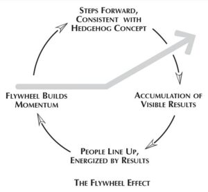 การวิจัยของเราแสดงว่าไม่ว่าผลลัพธ์สุดท้ายน่าทึ่งแค่ไหน การสร้างบริษัทที่ยิ่งใหญ่ไม่เคยปรากฏภายในครั้งเดียว เราไม่มีการกระทำระบุไว้อย่างเดียวไม่มีโครงการที่ยิ่งใหญ ไม่มีนวัตกรรมนักฆ่า ไม่มีช่วงเวลาที่อัศจรรย์ เเต่กระบวนการคล้ายกับการดันล้อตุนกำลังใหญ่และหนัก หมุนรอบแล้วรอบเล่า