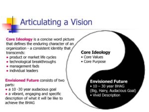 ด้านหนึ่งเรารักษาแกน อีกด้านหนึ่งเรากระตุ้นความก้าวหน้า เพื่อที่จะรักษาแกน องค์การที่มีวิสัยทัศน์มีค่านิยมแกนที่ไร้กาลเวลา – เหตุผลเพื่อการดำรงอยู่