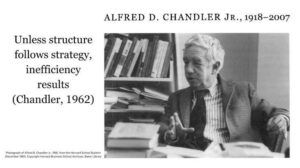 เเบบที่จะดำเนินการกลยุทธ์อย่างมีประสิทธิภาพ ไม่ใช่กลับกัน ด้วยการพัฒนาผ่านทางการวิเคราะห์ประวัติของบริษัทอเมริกันใหญ่ เช่น ดูปองท์ และเจ็นเนอรัล มอเตอร์ ภายในหนังสือต้นแบบ 1962 ของเขา Strategy and Structure เขาได้มองเห็นว่าบริษัทใหญ่เหล่านี้ ได้เผชิญกับกลยุทธ์การเจริญเติบโตและการกระจายธุรกิจใหม่ พัฒนาโครงสร้างแบบดิวิชัน – หน่วยธุรกิจ – บริหารการดำเนินงานที่ซับซ้อนของพวกเขามุมมองทางประว้ตเหล่านีแสดงว่าโครงสร้างองค์การป็นผลตามมาไม่ใช่ต้องมีก่อนกลยุทธ์